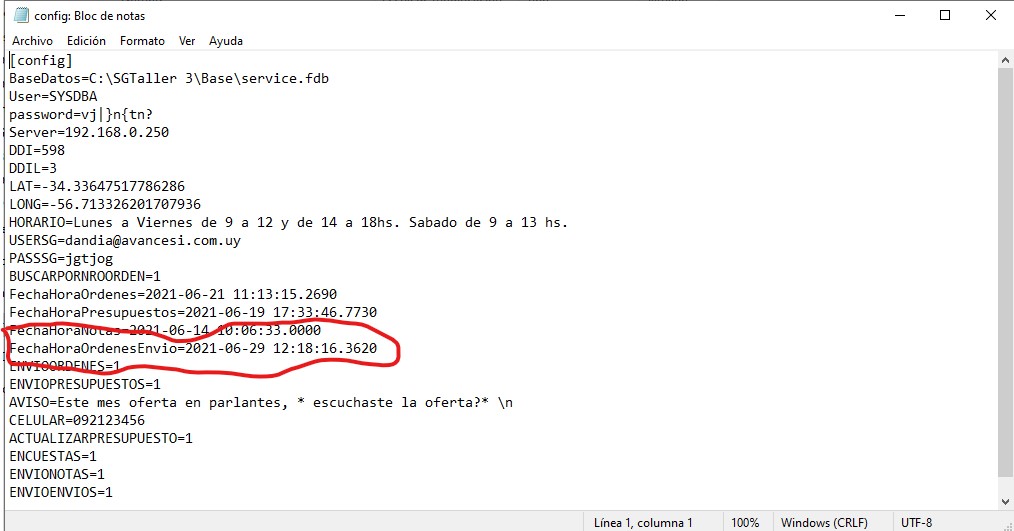 5. Agregar la siguiente línea en el archivo: FechaHoraOrdenesEnvio=2021-06-29 12:18:16.3620