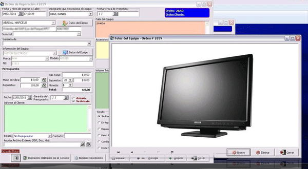 La posibilidad de incluir fotos del equipo para una orden de reparación, con lo cual se mantiene un histórico de fotos a lo largo de tiempo para cada reparación para cada equipo. También se puede imprimir un reporte de la ficha completa de reparación incluyendo las mismas. |