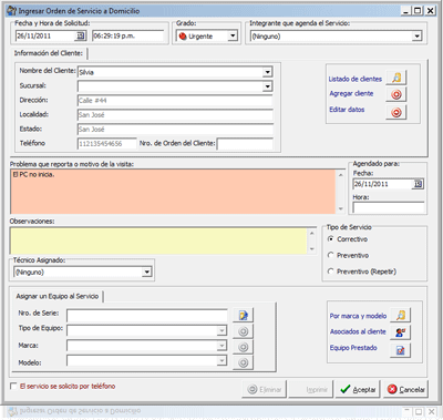 • Prioridad de las órdenes de servicio, la idea es simple, "normal", "urgente" y que aparezca una luz en la lista de servicios como de semáforo. • Se agregó un filtro a Lista de Usuarios para ver por defecto los activos, y con un check todos. • Aumento de caracteres a 100 de campo dirección para: empresa | clientes | proveedores | integrantes. • Renovación de interfaz gráfica: temas para las ventanas y controles. No compatible con todas las versiones de Windows, por lo que por defecto está desactivado. • Actualización de base de datos: todos los scripts se ejecutan desde dentro del programa, se analiza si existen campos, tablas, triggers, procedures y sino existen se crean. • Equipos Asociados al Cliente: Hasta la versión 2.2 se podía solamente asociar equipos al cliente pero no a la sucursales. Ahora se puede asociar equipos a sucursales y a su vez después al ingresar una orden de reparación o servicio buscar los equipos asociados a estos. |