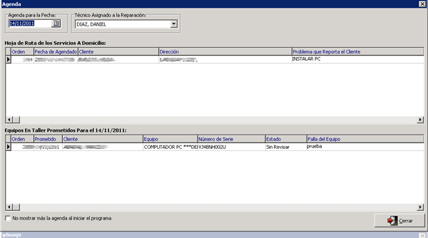Se agrego una agenda que muestra para una fecha y un técnico los servicios que tiene para el día y los equipos en taller prometidos para ese día. Por defecto se ejecuta al iniciar el programa y se puede configurar para que no aparezca más. |