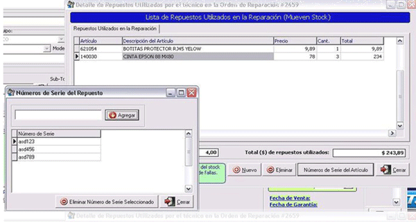 En los repuestos que utiliza el técnico en la reparación se pueden guardar los números de serie de los repuestos que se utilizaron. Esto permite en el futuro poder determinar por ejemplo en que órdenes se utilizaron los repuestos y que número de serie específicamente en cada uno. Por ejemplo, usted quiere saber: "¿el número de serie 123456 del repuesto XXX en que equipo lo colocamos? ". |