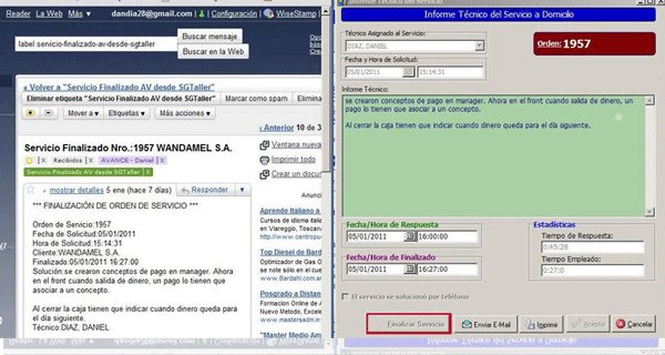 Cuando se ingresa una orden de servicio y cuando se finaliza la misma es posible configurar a que direcciones de correo SGTaller debe mandar e-mail con la copia del mismo incluyendo los datos del cliente, la fecha, quien lo agendo, para cuando, el problema reportado y el técnico asignado. Así mismo es posible configurar que le lleguen avisos al cliente por e-mail cuando se finalice una orden. |