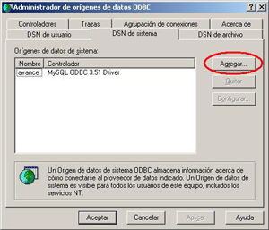 3- Al entrar vamos a la solapa DSN de sistema y hacemos clic en Agregar.
