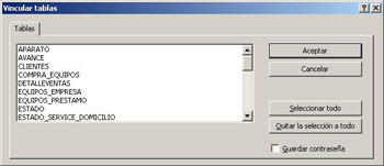 10- Ahora debemos seleccionar que tablas de nuestra base queremos vincular, puede ser una sola o todas. Seleccionamos y damos Aceptar. En este caso voy a seleccionar la tabla Reparaciones.