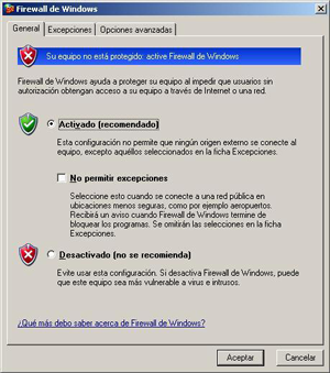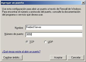 Abra el puerto 3050 en el equipo en el que esté ejecutando Firebird. Para poder conectarse con Firebird, hay que desactivar el Firewall de Windows o abrir el puerto 3050 en el equipo en el que esté ejecutando Firebird. El Service Pack 2 de Windows XP, añade un nuevo panel de control llamado Firewall de Windows, en la imagen siguiente.