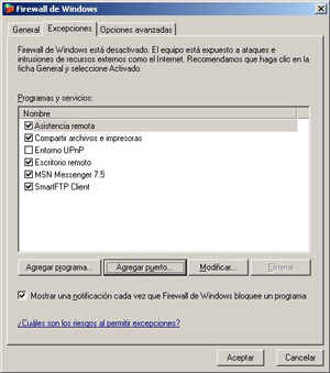 Si simplemente desea abrir el puerto 3050 seleccione el apartado "Excepciones". A continuación pulse el botón "Agregar puerto".