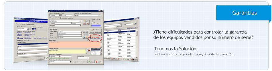 • Con la creación de este módulo hemos solucionado el problema de control de garantías incluso para aquellos clientes que ya poseen otro sistema de facturación, pero que al no estar integrado a SGTaller se les hace difícil relacionar la venta con el número de serie del equipo. |
