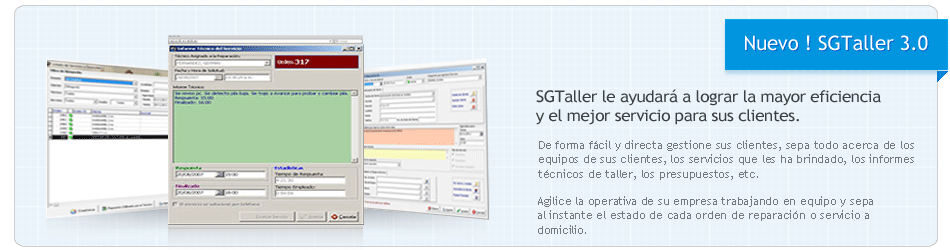 • Consulta de historial de equipos: informe técnico, presupuesto, repuestos. • Tiempos por estado de trabajo. • Soporte para redes. • Asignación de tareas a miembros del personal. Perfiles de usuarios con niveles de acceso por contraseña. • Reportes de incidencias por clientes y por equipos. • Ingresos al taller por períodos de tiempo. • Servicios a domicilio por períodos de tiempo. |